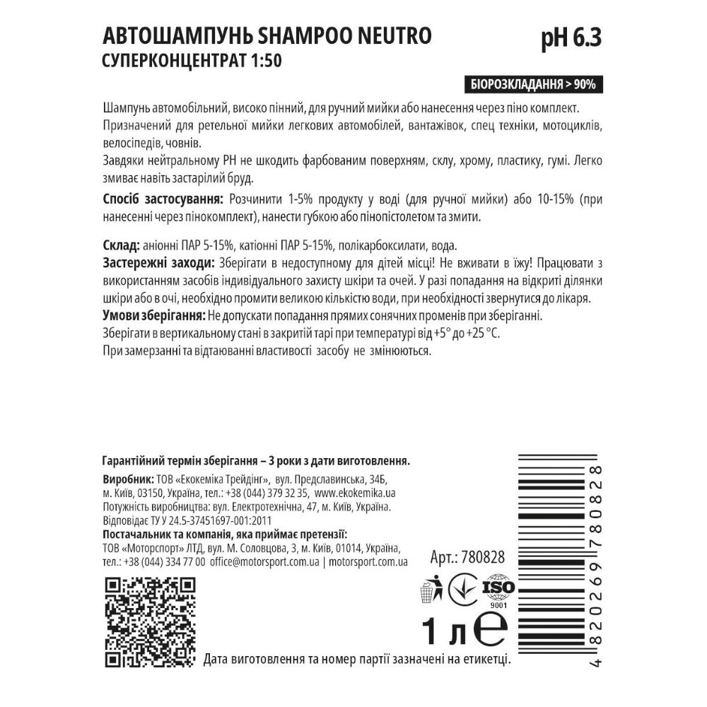 Автошампунь Ekokemika Pro Line SHAMPOO NEUTRO 1 л (1:50), артикул 780828