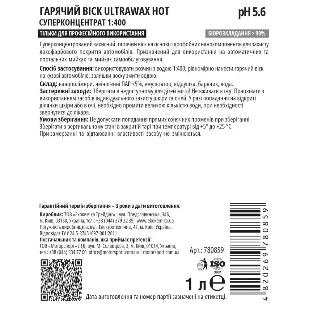 Ekokemika Pro-Line Ultrawax Hot Гарячий віск – професійний продукт для створення інтенсивного захисного шару на лакокольоровому покритті автомобіля за допомогою термічного методу нанесення. Формула віsku містить високоякісні полімерні компоненти, які забезпечують глибокий глянтовий блиск і тривалу захисту.
