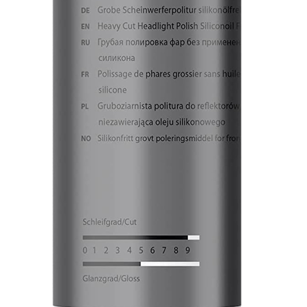 Інноваційний засіб для машинного полірування фар ризики глибиною зернистості від P1000. Допомагає швидко відновити сильно помутнілі фари PMMA (з поліметилметакрилату), ефективно видалити дрібні дефекти і "павутинку" з подряпин. використовуючи щільні абразивні кола типу Heavy Cut Pad або кола з поверхнею із овчинного хутра. Процес полірування повинен відбуватися при середній кількості оборотів і середньому тиску. Для досягнення максимального ефекту полірування рекомендується додатково обробити поверхню за допомогою лаку для фар Headlight Polish 2. Попередження: Перед використанням збовтати. Не використовувати на гарячих поверхнях. Перед використанням перевірити на придатність та сумісність.