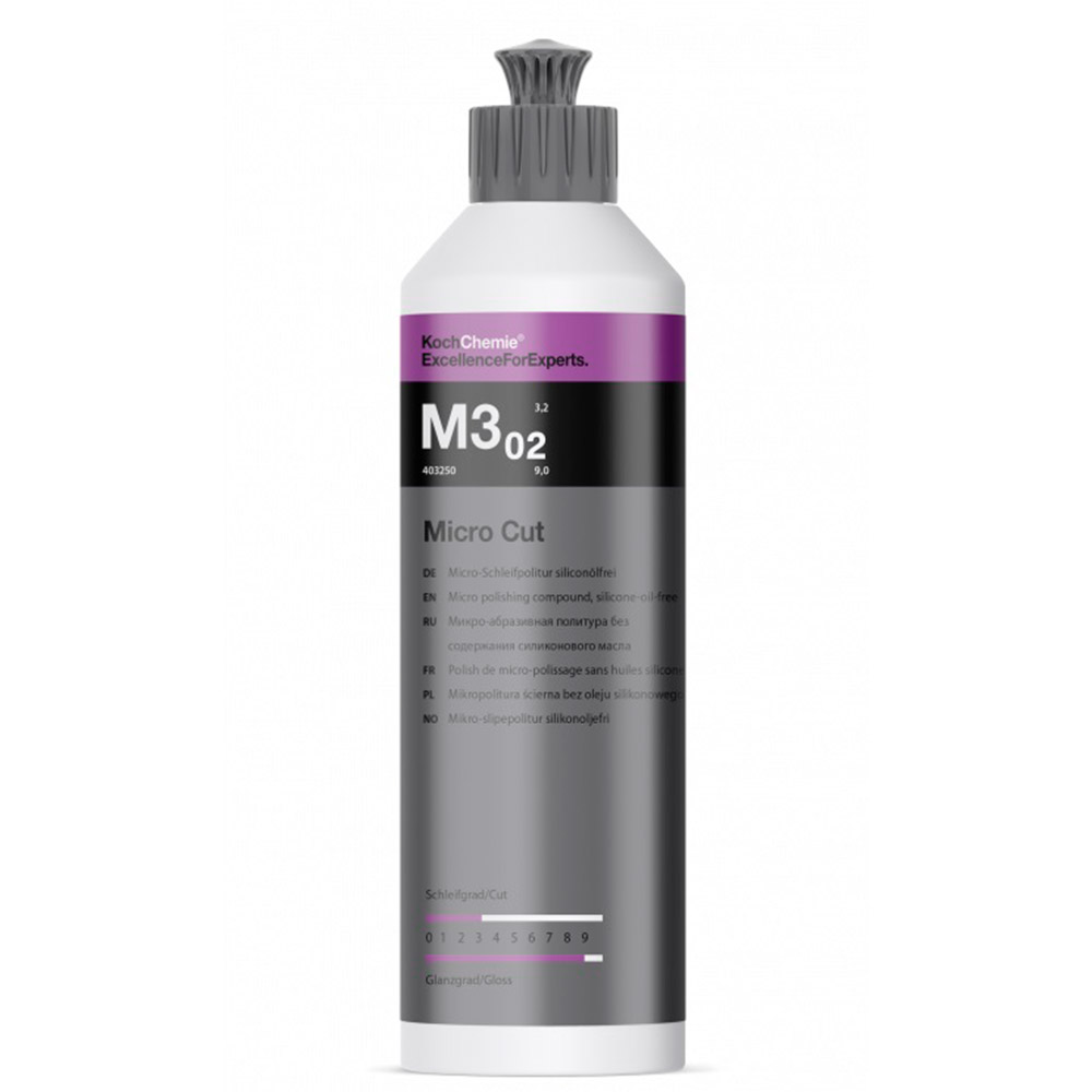 Політура для дзеркального блиску з усуненням ефекту „голограми“ Micro Cut M3.02 – машинний мікро-поліруючий склад останнього покоління , призначений для довготривалого усунення полірувальної "вуалі", "голограм", дрібних подряпин і аншліфів до розміру зернистості 3.000 на всіх лакофарбових системах (включаючи системи, стійкі до виникнення подряпин). Завдяки використанню високоспеціалізованих, супероднорідних абразивних матеріалів навіть на темних та подібних чутливих колірних тонах покриттів за екстремальних умов освітлення виходить блискучий та стійкий результат заключної обробки із дзеркальним блиском. Ефект „голограми“ та дрібні подряпини механічно усуваються, а не замазуються, як це часто буває.За рахунок цього може застосовуватися для полірування в один крок. Політура для дзеркального блиску з усуненням ефекту „голограми” Micro Cut M3.02 надзвичайно економічна, добре полірується і знімається без залишку. машини з примусовим обертанням (максимальна кількість обертів). Як альтернатива можлива обробка за допомогою ротаційної полірувальної машини. Перед використанням засохлі або нові губки слід просочити політурою. Вимкненою полірувальною машиною рівномірно нанести політуру на оброблювану поверхню, а потім легкими рухами розполірувати перехресним способом до тих пір, поки не утвориться прозора плівка, тобто поки не відбудеться повне розкладання оксиду алюмінію, що міститься. Кола, використані для нанесення цього продукту, не застосовують для нанесення інших продуктів. Для усунення залишків політури без нанесення подряпин та штрихів ми рекомендуємо використовувати нашу фірмову мікрофіброву серветку.