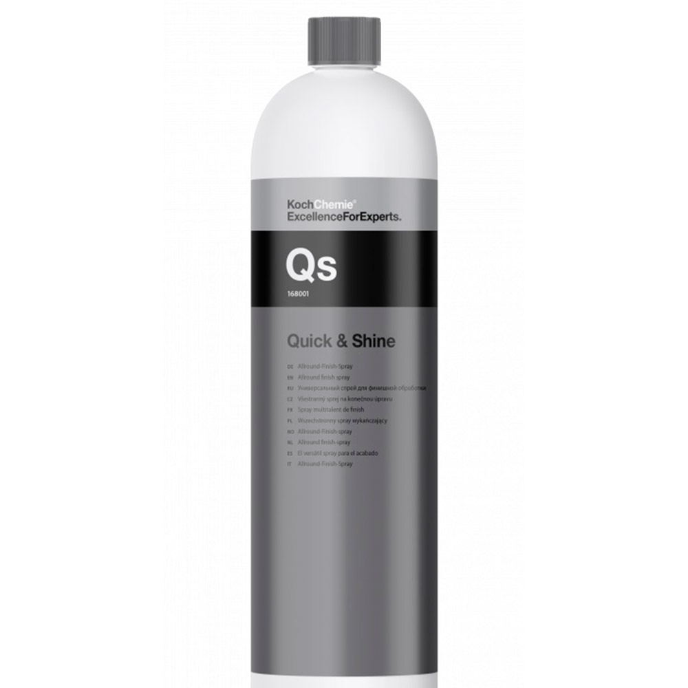 Koch Chemie Qs Quick & Shine. Відрізняється всебічним застосуванням для будь-яких лакованих поверхонь, скла, пластмаси та пластику. За рахунок своєї особливості обволікати бруд і не давати йому стикатися з оброблюваною поверхнею, ідеально видаляє з лакофарбового покриття незначні забруднення, розлучення від дощу, малу запиленість та екскременти птахів.