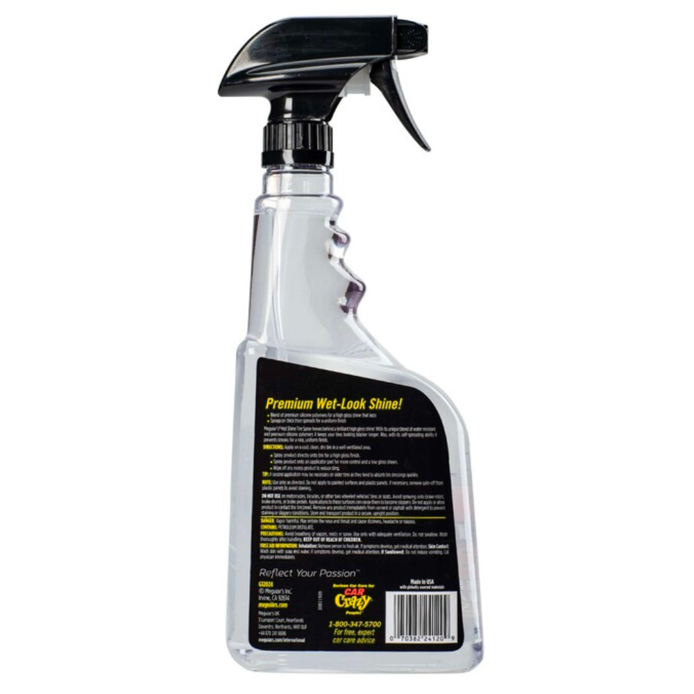 Спрей для догляду за шинами Meguiar's Hot Shine Tire Spray G12024 ефективно прибере дорожній наліт, залишки гальмівної рідини та інші забруднення, надасть їм блиску та доглянутого вигляду.