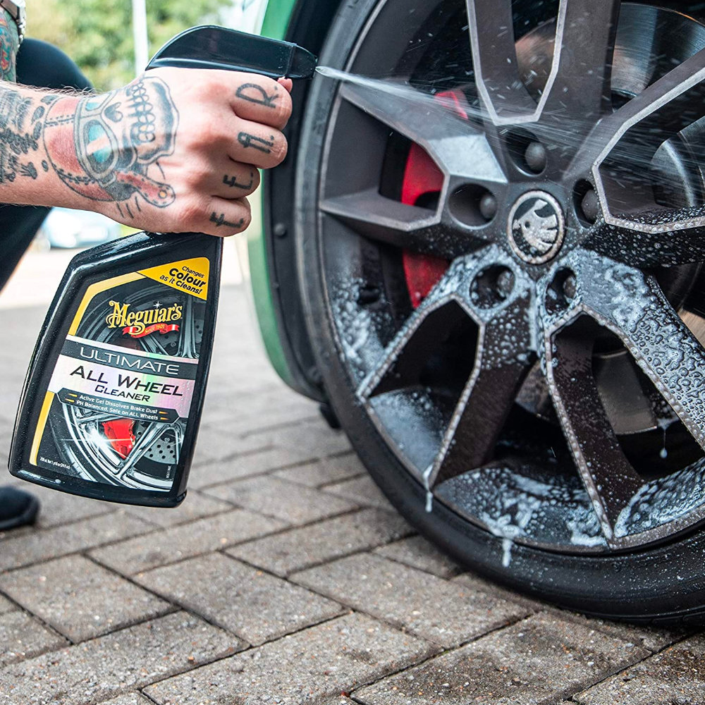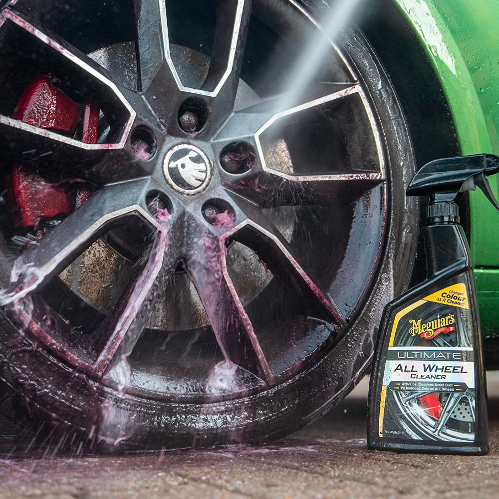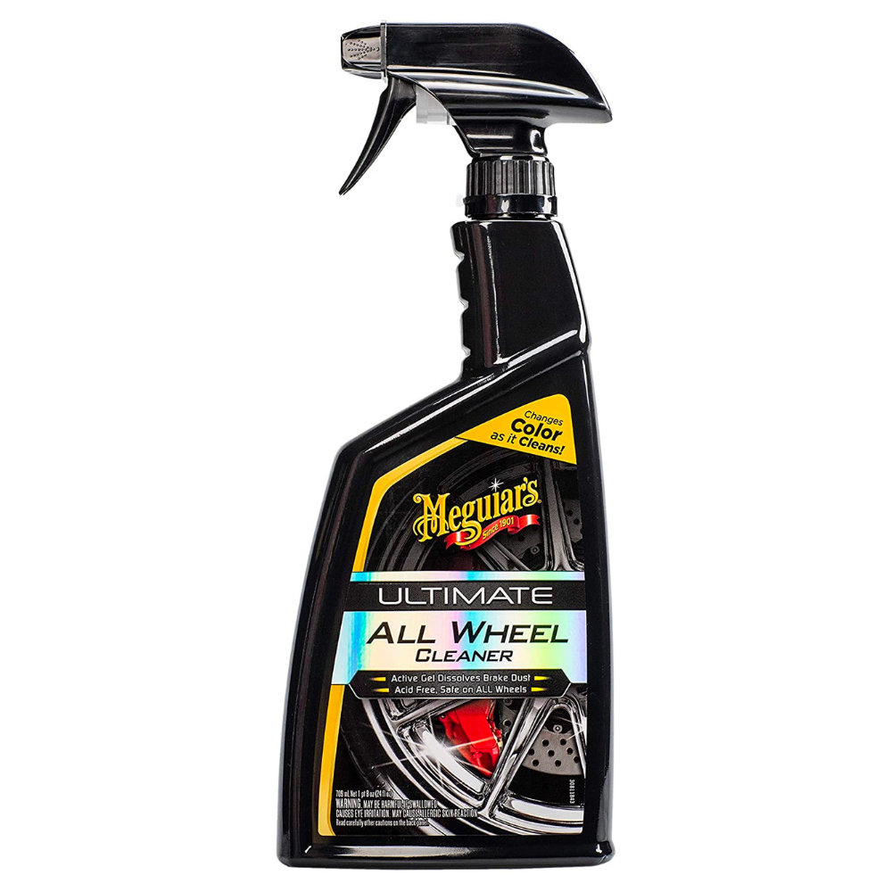 Ефективний та безпечний спрей Meguiars Ultimate All Wheel Cleaner G180124, який можна використовувати на дисках усіх видів. Справляється з гальмівною рідиною, пилом, брудом, що глибоко в'їлося. Засіб проникає в забруднення, роблячи гальмівну фіолетову рідину, а забруднення - коричневими, і потім розчиняє їх. До складу не входять кислоти, формула pH нейтральна, що робить цей продукт універсальним очисником для всіх видів коліс.