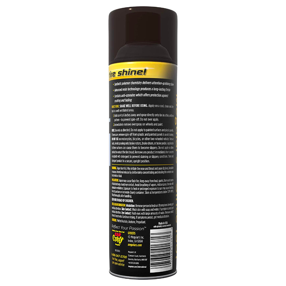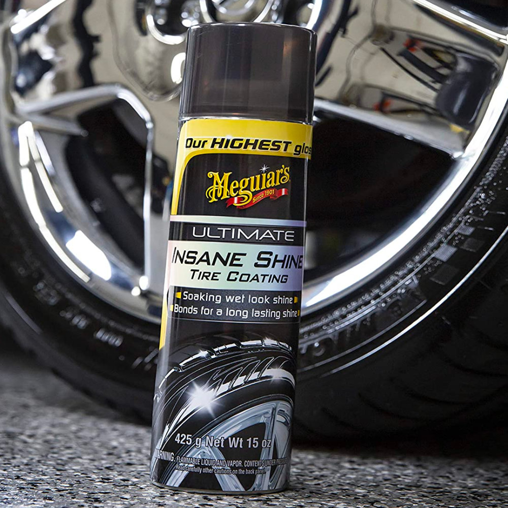 Новий спрей для чорніння гуми Meguiars Ultimate Insane Shine Tire Coating G190315, додасть шинам виражений блиск і захистить від розтріскування та висихання.