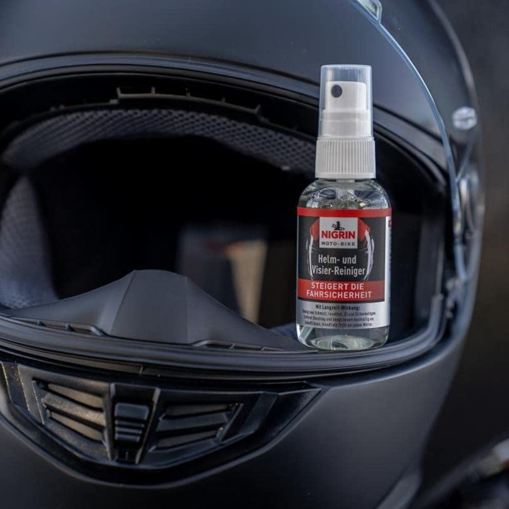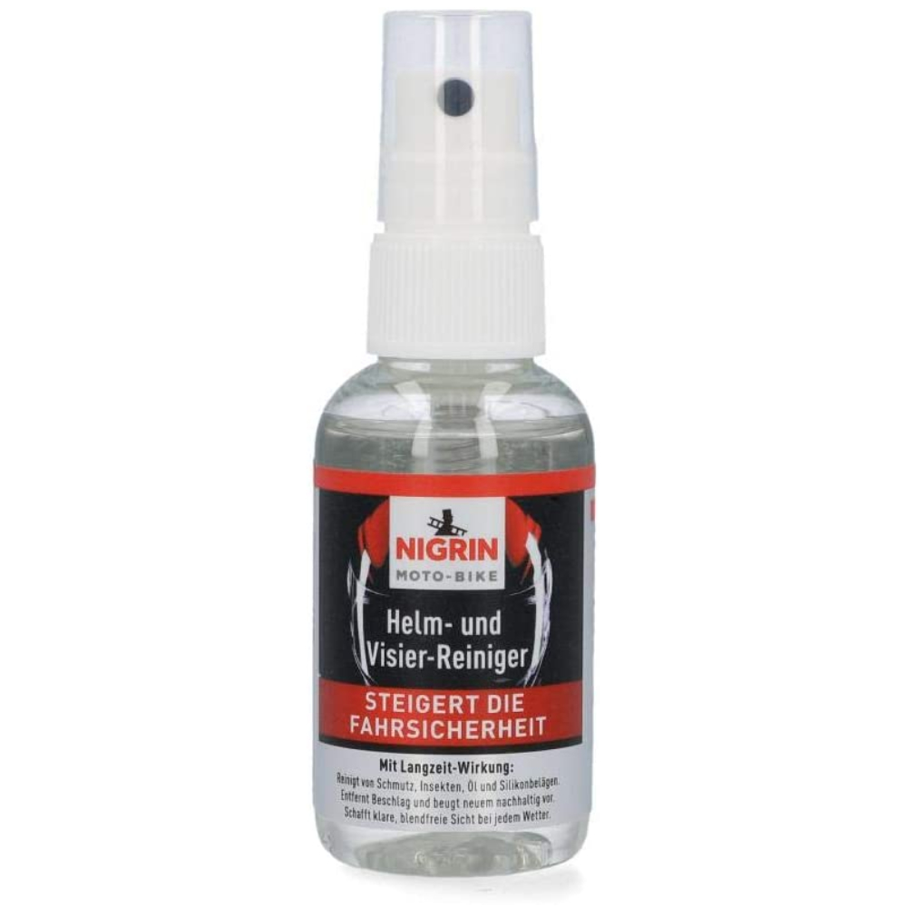 Німецький очисник скла мотоциклетного та велосипедного шолома NIGRIN Moto-Bike Helm-und Visier-Reiniger für Motorrad mit на 50 мл. Ефективно та швидко очищає поверхню від пилу, бруду, слідів комах. Має антизапотівний ефект.