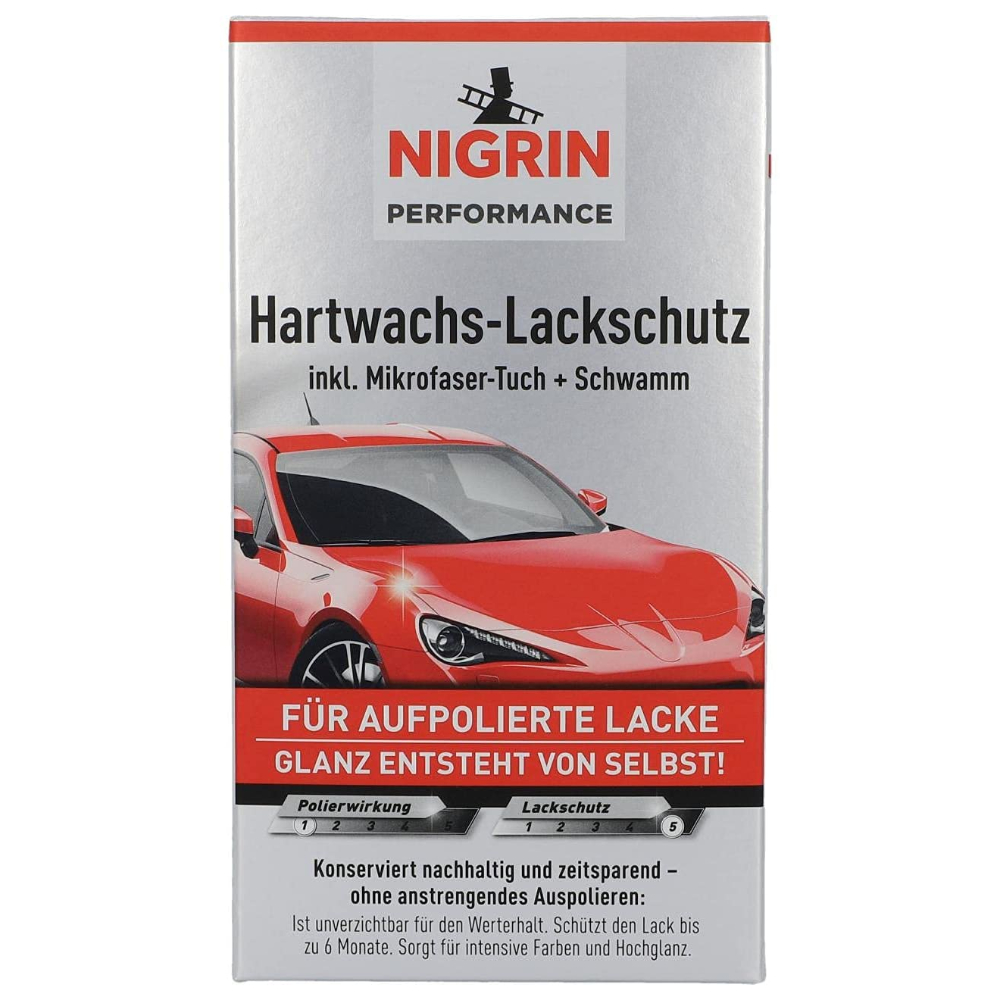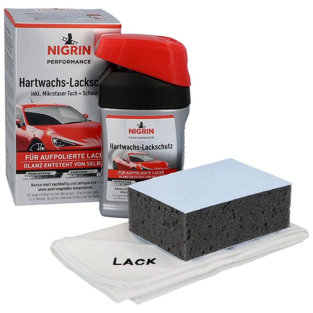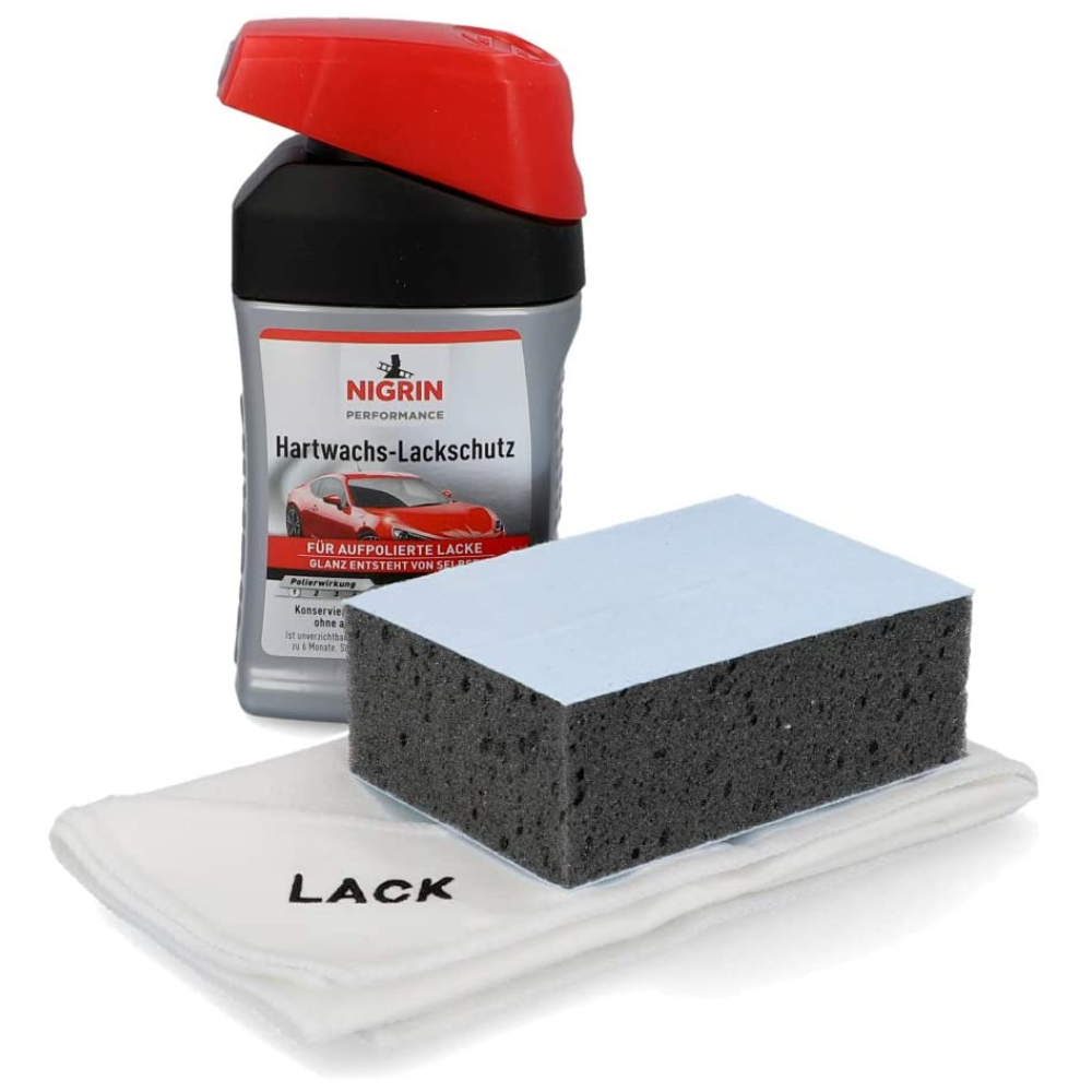 Німецький набір містить мікрофібру, аплікатор для полірування інеабразивний захисний восковий поліроль NIGRIN Hartwachs-Lackschutz Turbo - це дрібно абразивний поліроль з високим вмістом захисного водовідштовхування захисний шар на фарбі барвисті покриття автомобіля. Максимально м'який до поверхні. Підходить як захисний шар після поліролю, що очищає, або для профілактичного захисту і довгого блиску кузова. Захищає кузов і надає лаку блиску завдяки високому ступеню воскової складової. Це фінішний поліроль для захисту та блиску лако барвистого покриття. Його ефект можна продовжити за допомогою використання рідкого воску.