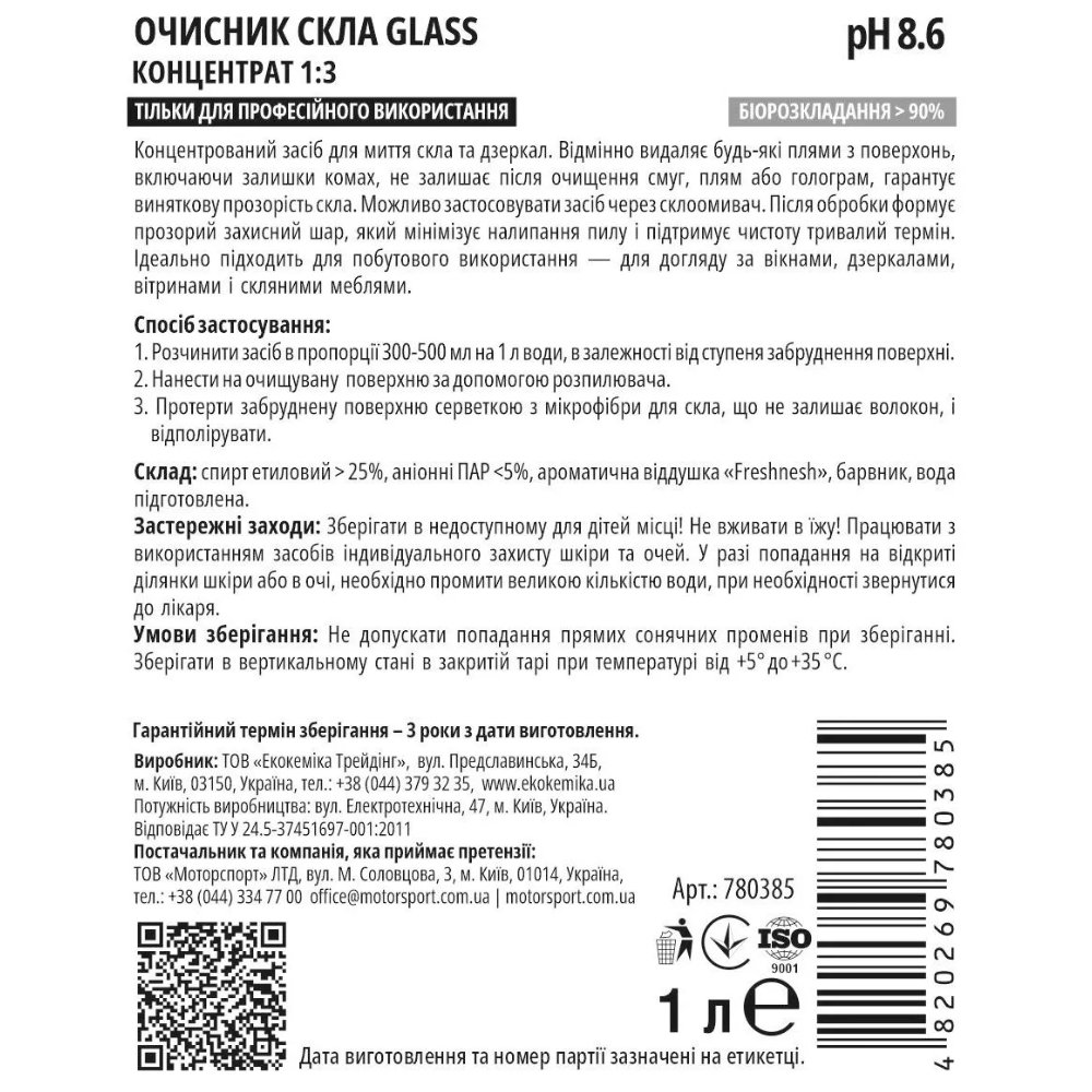 Очиститель стекла, 1 л (концентрат), Ekokemika Pro-Line GLASS 1:3 (780385)