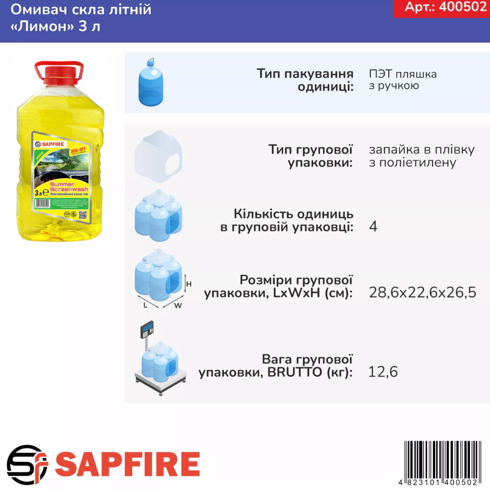Омыватель стекла летний, 3 л, Sapphire SUMMER SCREENWASH (лимон) (400502)
