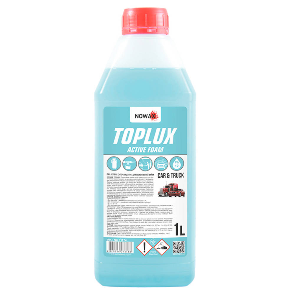 Профессиональное щелочное средство премиум-класса NOWAX TOPLUX Active Foam для бесконтактной мойки легкового и грузового автотранспорта с высоким уровнем пенообразования. Благодаря уникальной формуле, в состав которой входят нано-детергенты, средство легко удаляет сильные загрязнения от дорожной пыли, следов насекомых и жировых загрязнений, а так же статическую пленку.