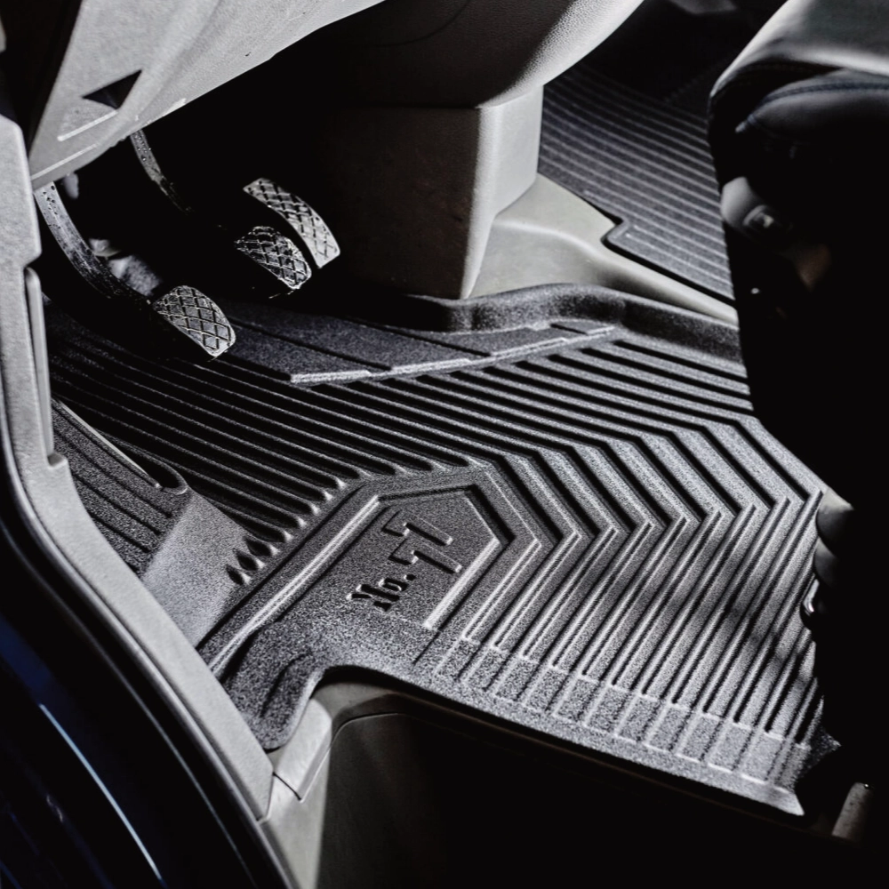 Одним из ключевых преимуществ ковриков No.77 является технология MaxEdge — высокий бортик до 4 см с жёстким усилением по периметру. Он надёжно удерживает воду, снег, песок и грязь внутри коврика, не позволяя им растекаться по салону. Бортик не заваливается со временем и сохраняет форму даже при активной эксплуатации. Водительский коврик дополнительно усилен в зоне отдыха левой ноги, что значительно увеличивает срок службы и предотвращает преждевременное истирание.