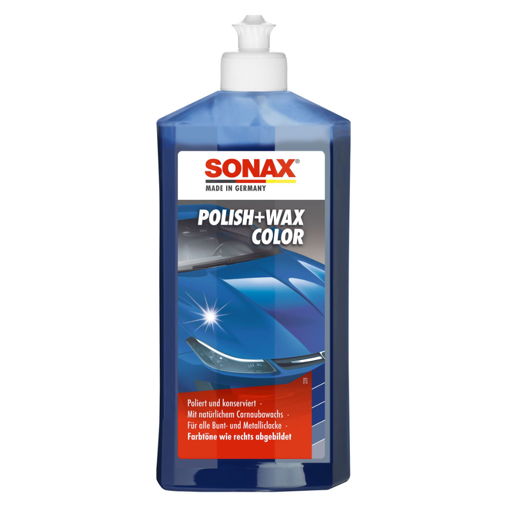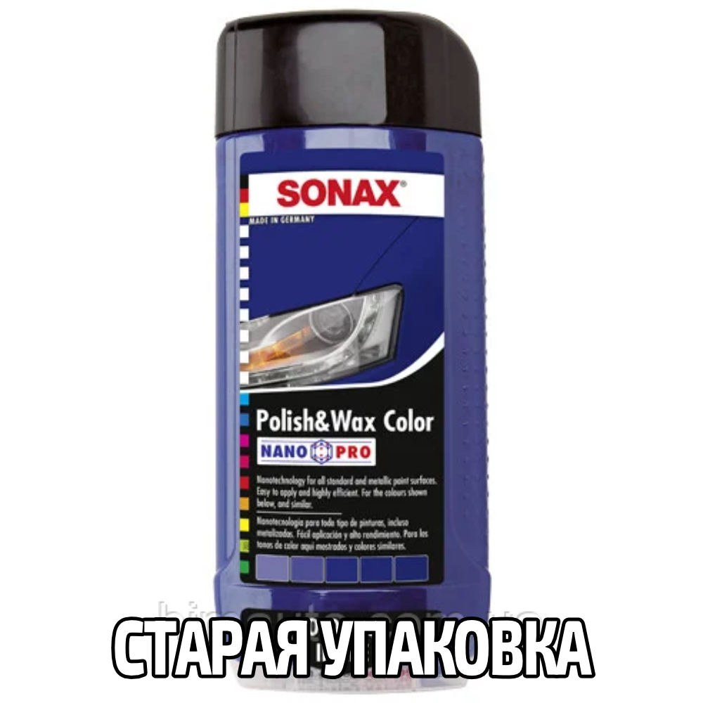 Синий полироль SONAX Polish +Wax Color White 296200 500 мл с тефлоном (PTFE) и воском для восстановления цвета. Ранее продукт назывался SONAX Polish & Wax NanoPro. Также ранее в упаковках на 500 мл были восковые карандаши, после обновления ушла и приставка NanoPro из названия, и карандаш из большой упаковки.