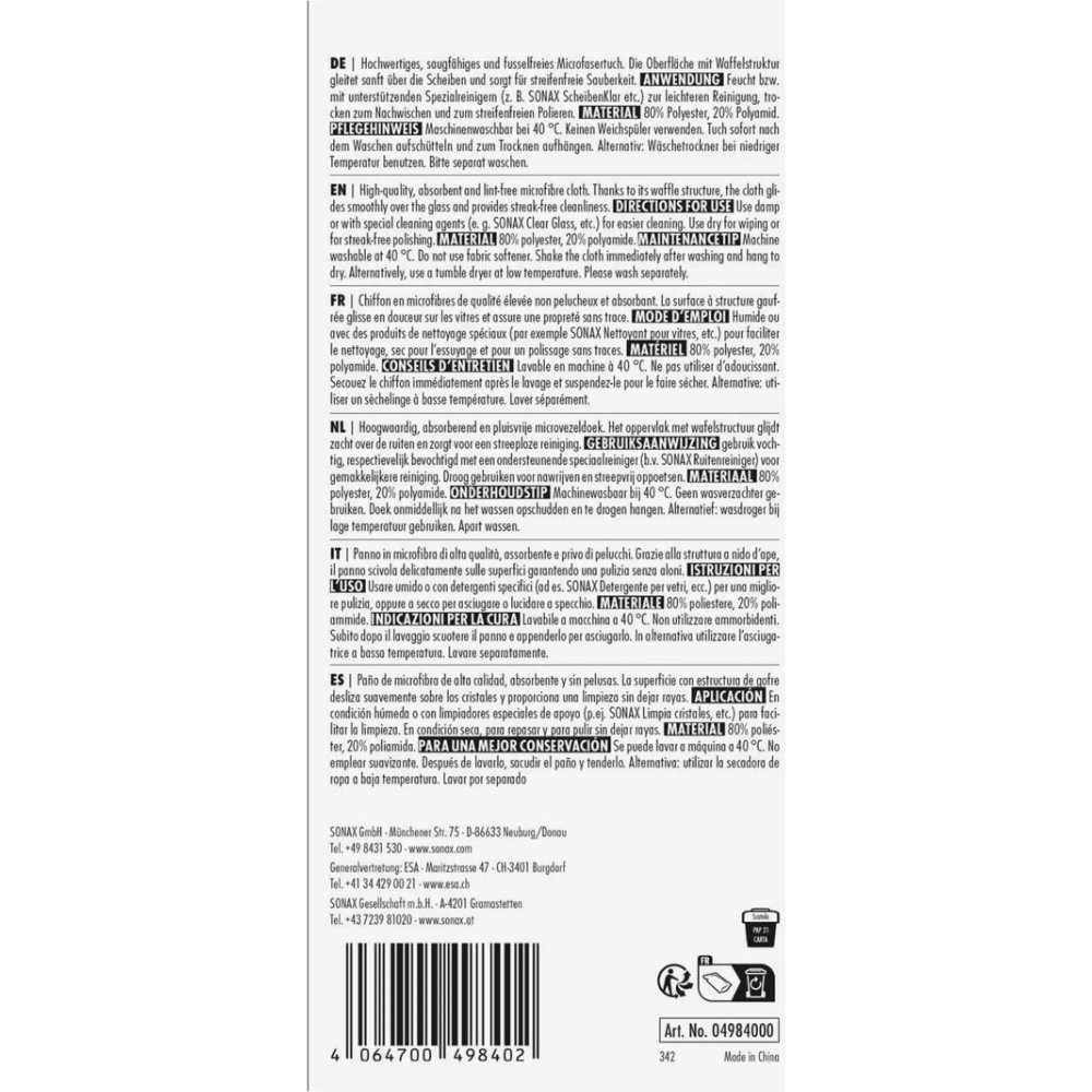 Салфетка из микрофибры для стекла и интерьера, 38x38 см, Sonax Microfasertuch Scheibe/Innen (498400)