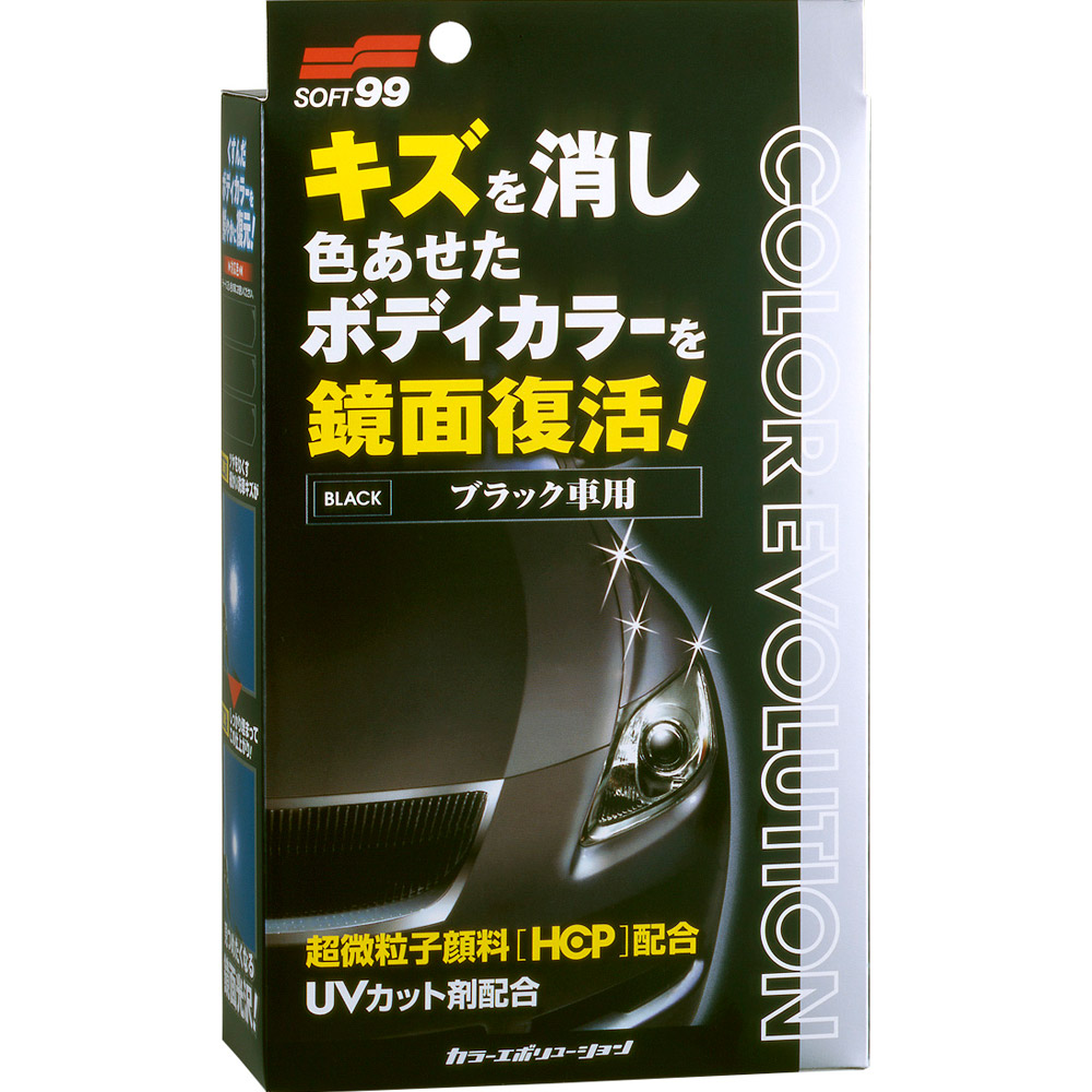 Колір збагачуюча поліроль для чорних автомобілів SOFT99 Color Evolution Black 00503. Color Evolution — кольорозбагачувальна поліроль повністю маскує дрібні пошкодження в шарі фарби, заповнюючи їх уретановою смолою з акриловим барвником. Пігментні мікрочастинки, що входять до складу поліролі, легко проникають у найдрібніші тріщини і застигаючи в них блискуче відновлюють початковий колір автомобіля. Крім того, сучасні полімерні технології у складі даного продукту створюють бар'єр для вицвітання лакофарбового покриття на період дії складу.