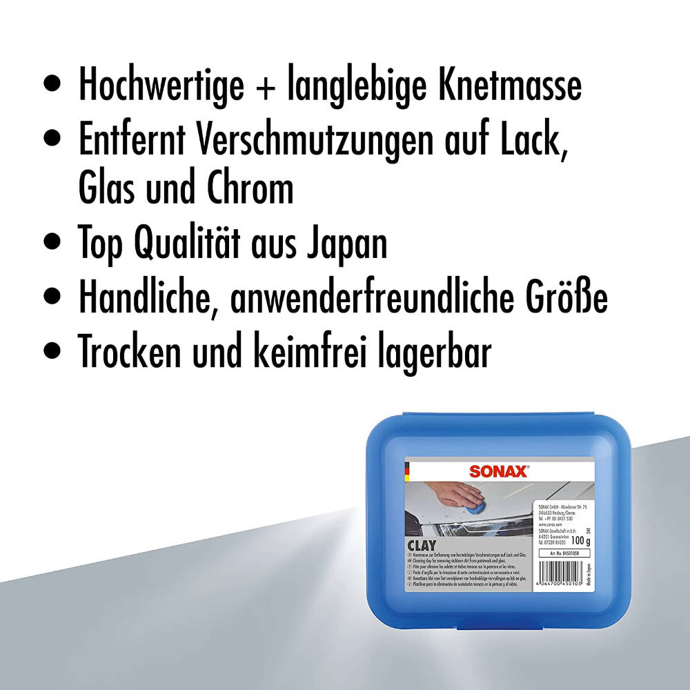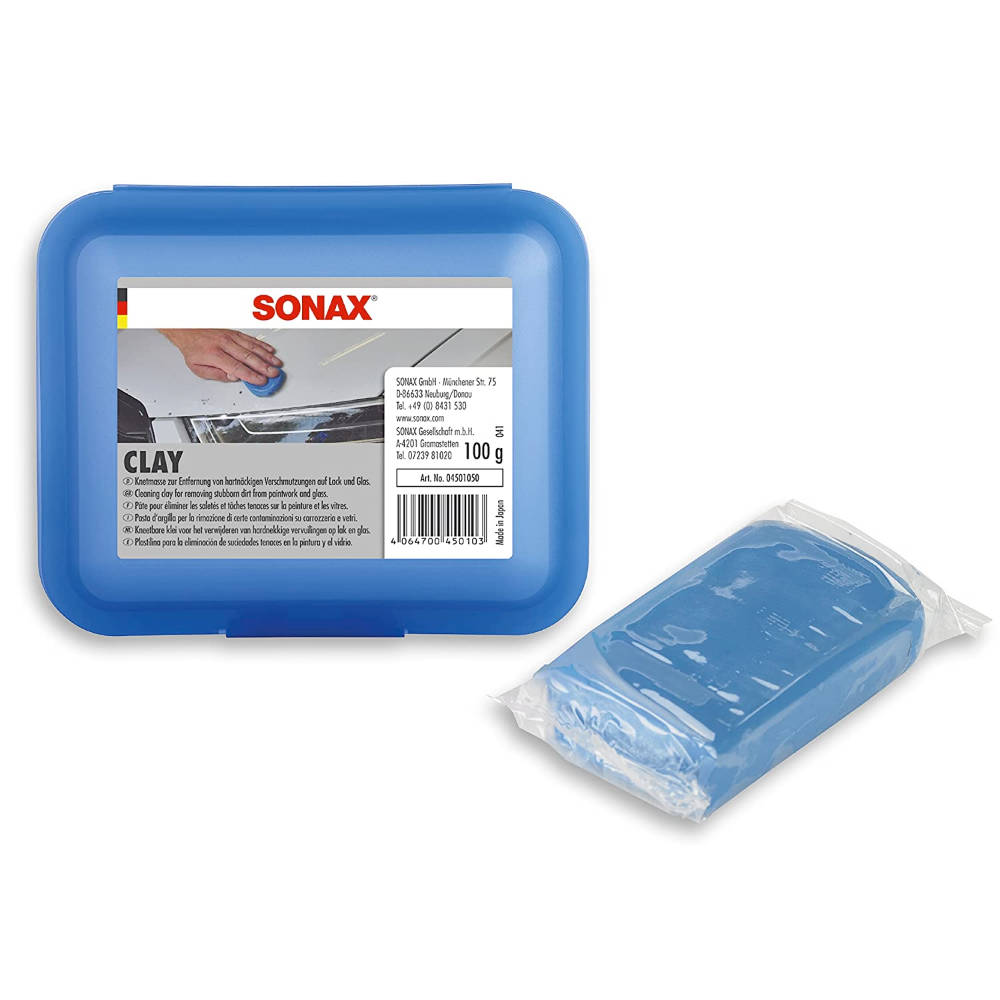 Специальная низкоабразивная очищающая синяя синтетическая глина SONAX Clay (450105) для удаления брызг после покраски автомобиля, промышленной пыли, налета ржавчины и окислов, древесной смолы, битума и других стойких загрязнений такого типа с лакокрасочной поверхности автомобиля. Вес 112 грамм.