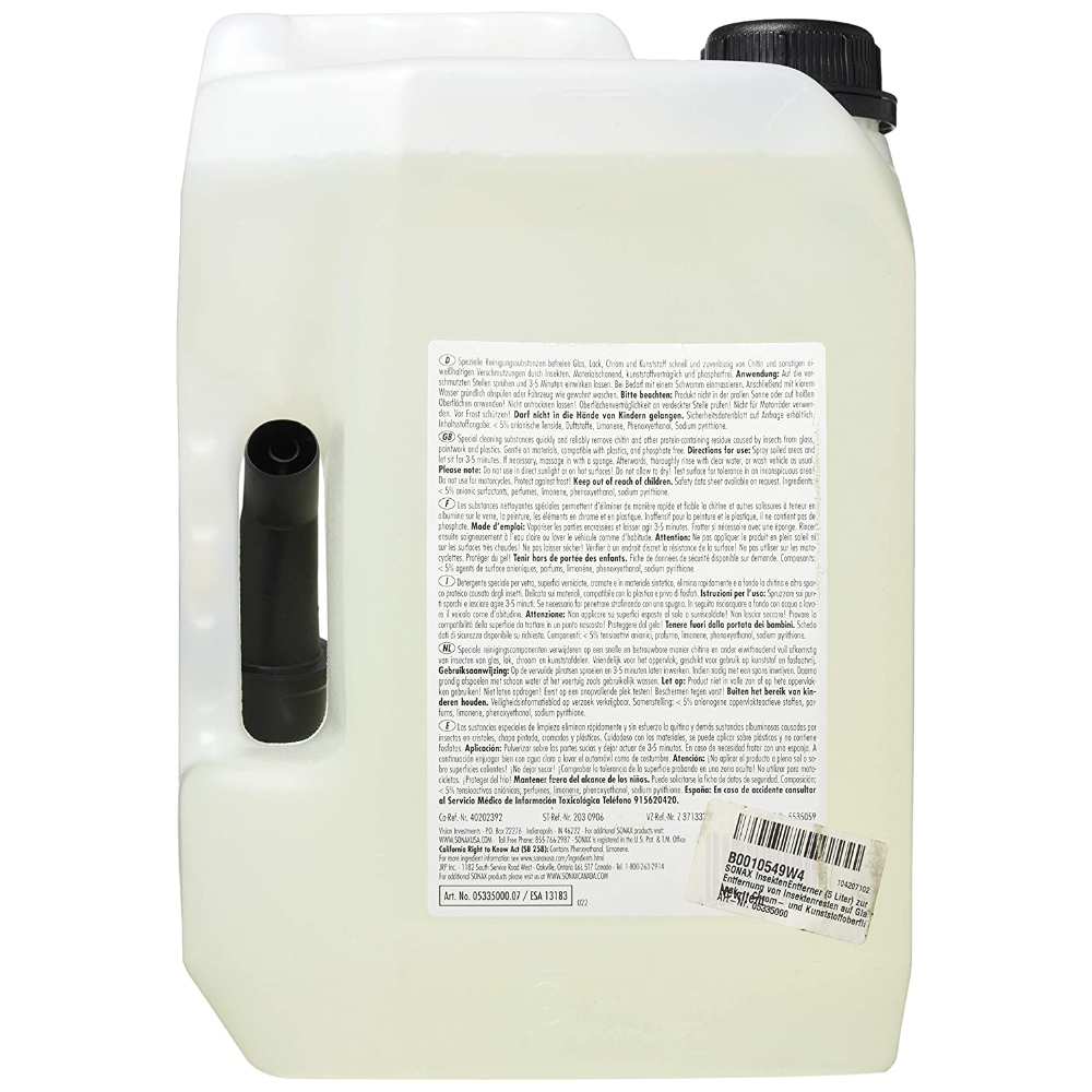 Специальный очиститель антимошка SONAX Insect Remover (Insekten Entferner) 5 л 533500 для удаления остатков насекомых с лакокрасочного покрытия кузова автомобиля, стеклянных, хромированных и пластиковых поверхностей. Новая формула обеспечивает еще более легкое и быстрое проникновение очистителя в плотные и твердые загрязнения остатков насекомых, размягчает их до состояния, после чего достаточно лишь протереть обработанную поверхность губкой. Очиститель проверен на совместимость с лакокрасочным покрытием, пластиком, стеклом, хромом. Идеально подходит для предварительной обработки перед мойкой автомобиля.