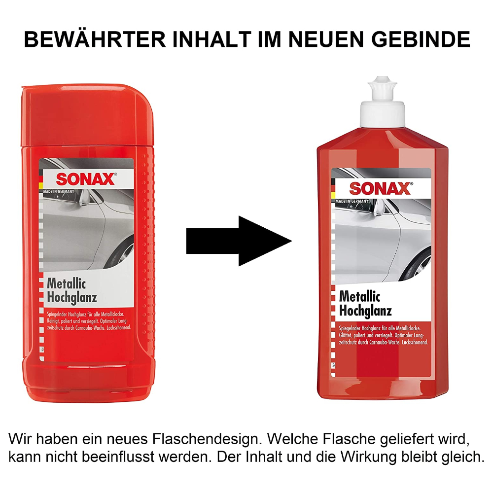 Поліроль металік SONAX Metallic High Gloss 317200 500 мл з тефлоном (PTFE) і воском для відновлення кольору. Він розгладжує, полірує та зберігає всі види покриттів за один прохід. Усуває невеликі подряпини та збагачує колір автомобіля. Погані ділянки лакофарбового покриття покриваються кольоровими пігментами і захищаються від корозії. Надає лакофарбовому покриттю яскравого кольору, забезпечує відмінний блиск та довготривалий захист від атмосферних впливів завдяки натуральному воску карнаубу.