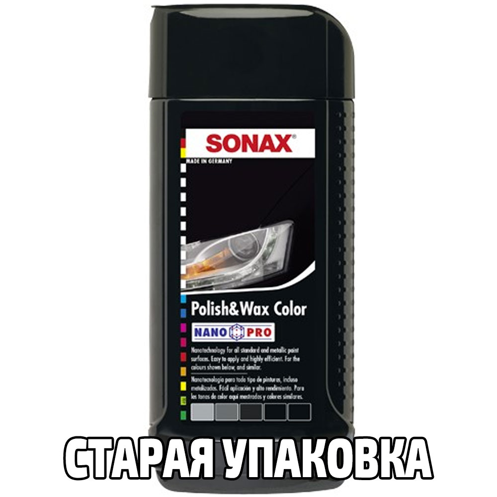 Чорний поліроль SONAX Polish +Wax Color Black 296141 250 мл з тефлоном (PTFE) і воском для відновлення кольору. У спектр допустимих для обробки кольорів кузова входять кольори від яскраво чорного до темно-сірого (видно на фото упаковки). Раніше продукт називався Sonax Polish & Wax NanoPro. Також раніше в упаковках на 500 мл були воскові олівці, після оновлення пішла і приставка NanoPro з назви, і олівець із великої упаковки.