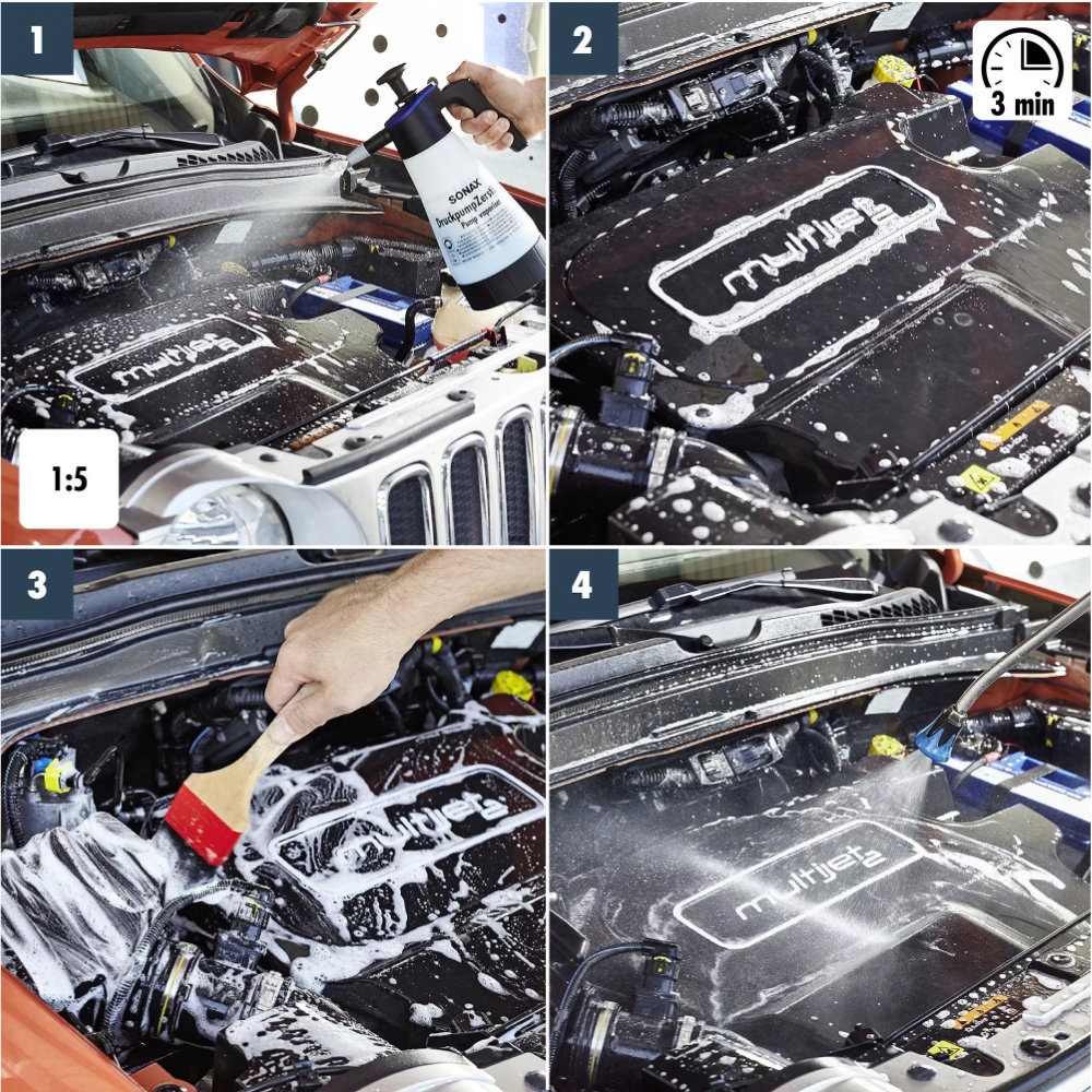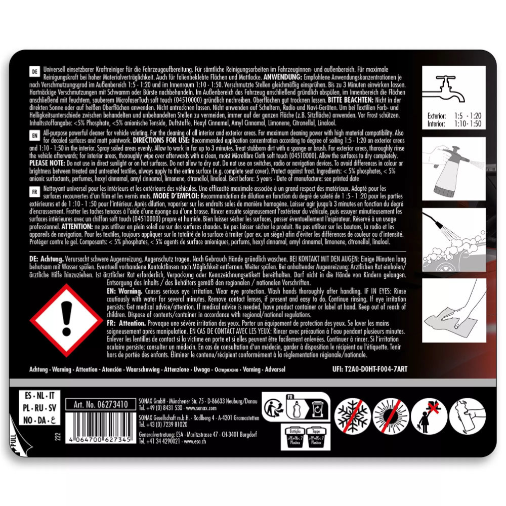 Стойкие загрязнения можно дополнительно обработать с помощью губки или щетки. После этого тщательно промойте под большим давлением или протрите влажной салфеткой из микрофибры. Не допускайте Sonax Multistar работать на теплых и горячих поверхностях, под прямыми лучами солнца, а так же не допускайте высыхания. Sonax Multistar необходимо беречь от низких температур.