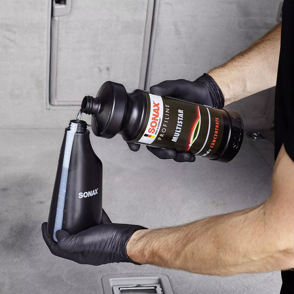 Концентрированное универсальное средство для чистки интерьера и экстерьера от Sonax (до 200 литров готового продукта). Sonax Multistar применяется для ухода за всеми поверхностями автомобиля, а также для предварительной подготовки автомобиля в автоматических мойках. Sonax Multistar обладает высокими очищающими качествами и совместимостью с материалами. Применим для любых работ по очистке как внутренних, так и внешних элементов автомобиля. Состав применим для использования с оборудованием для очистки под высоким давлением, горячей водой и паром, а также для ручного нанесения.