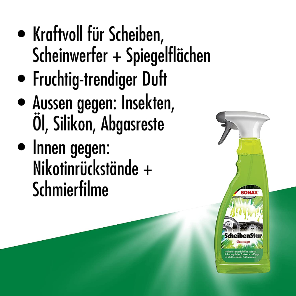 Очиститель стекла, оптики и зеркал SONAX ScheibenStar 750 мл 234400. Эффективный очиститель стекла с приятным фруктовым ароматом. Отлично удаляет любые пятна с поверхностей, включая остатки мошек, битум, почки деревьев, маслянистые и жирные, не оставляет после очистки полос, пятен или голограмм, гарантирует исключительную прозрачность стекла для комфортного и безопасного управления автомобилем в любое время суток.