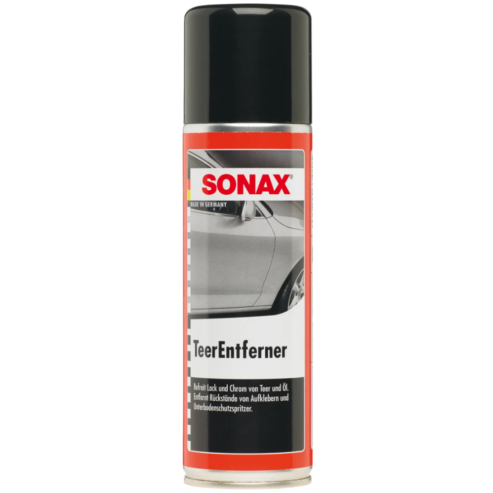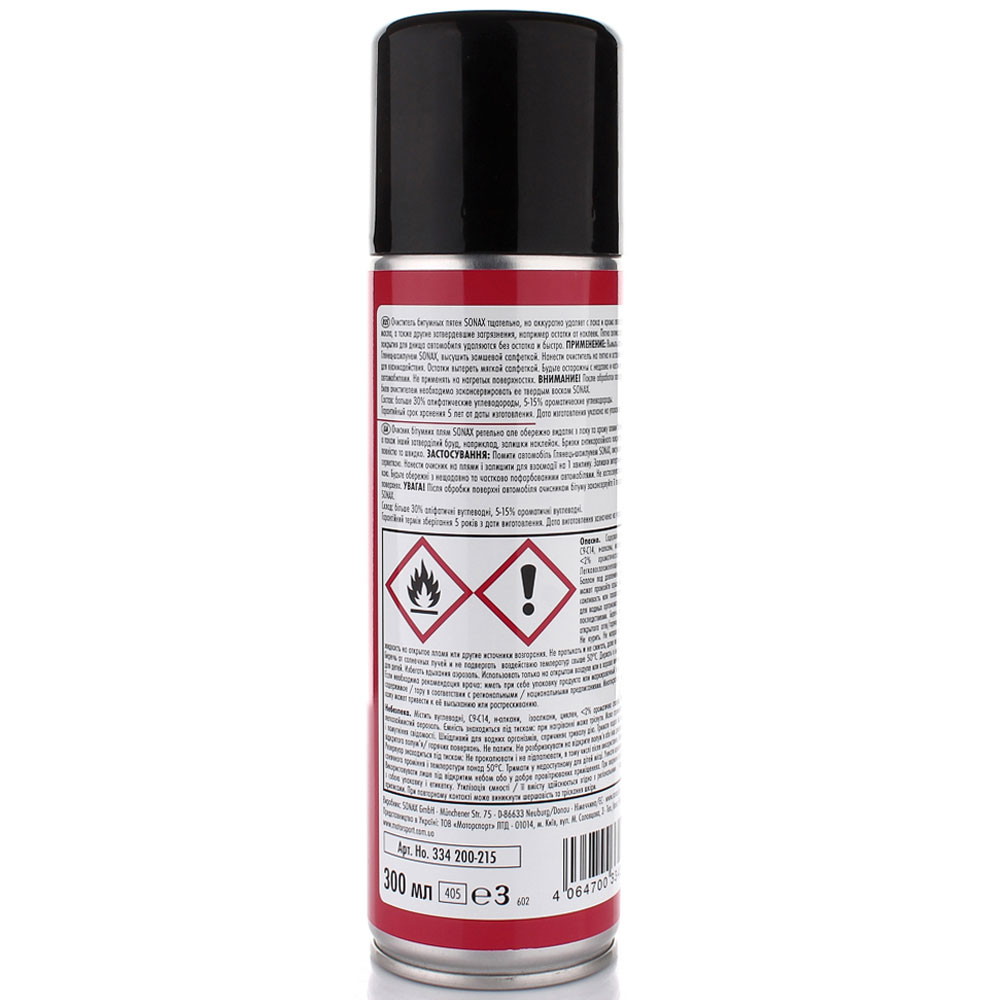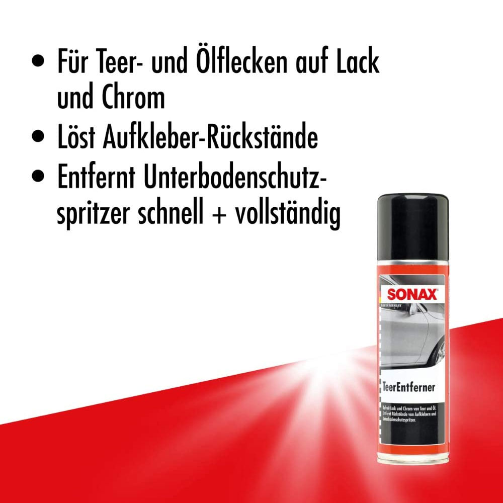 Средство для удаления битума SONAX Tar Remover (Teerentferner) 300 мл 334200 бережно и тщательно удаляет смолу и масляные пятна с лакокрасочного покрытия и хрома, а также другие стойкие загрязнения, например, остатки наклеек. Быстро и полностью удаляются даже брызги от защиты днища (битум, каучук, мовиль).