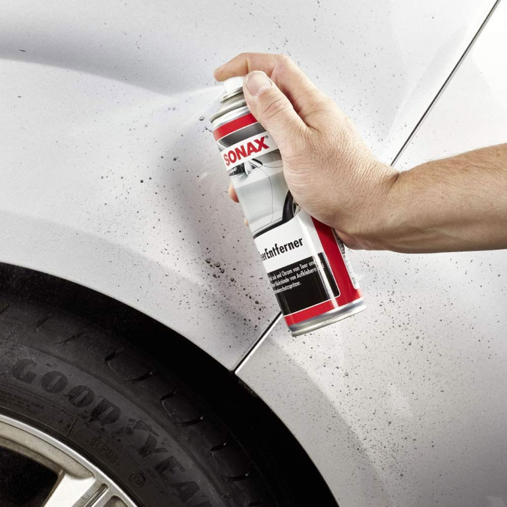 - Распылите на загрязнение средством для удаления битума SONAX и дайте ему подействовать примерно на 1 минуту.