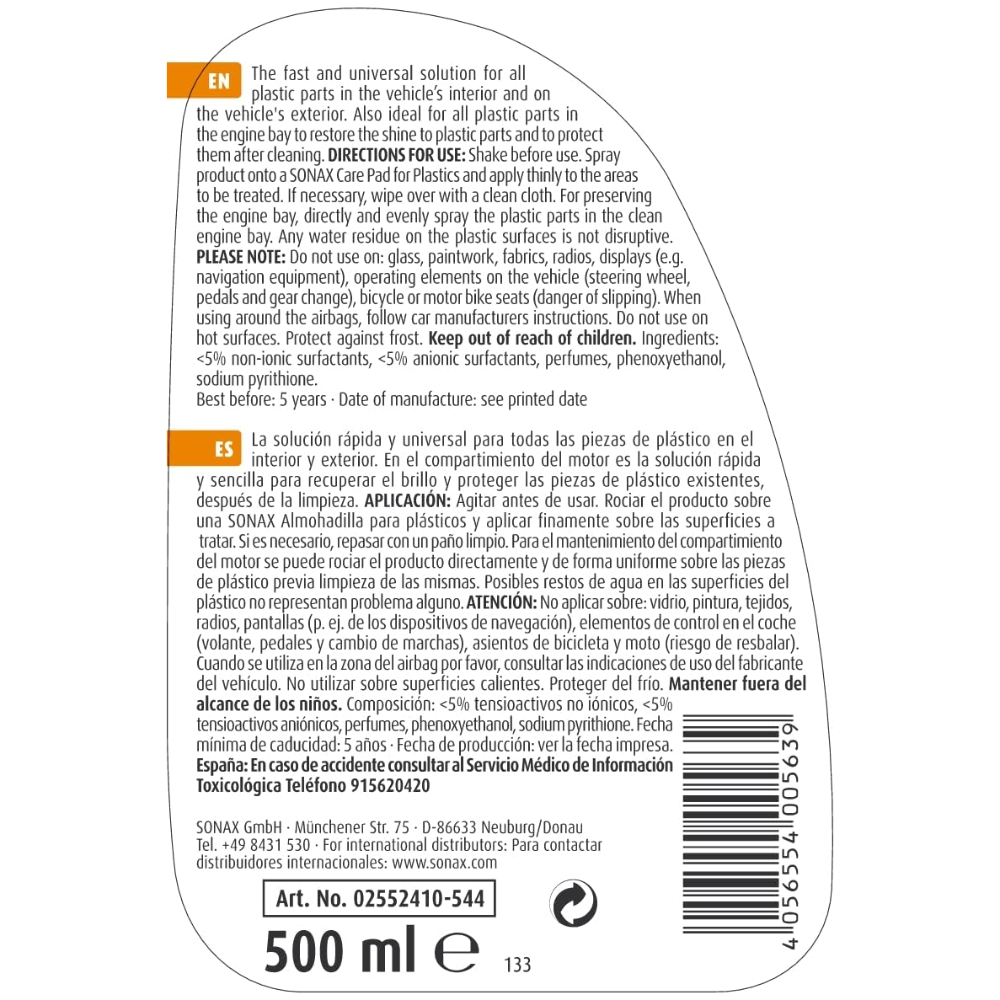 Применим в интерьере для очистки и ухода за всеми пластиковыми деталями (например, дверными панелями, торпедо, центральной консолью, панелями сидений и т. д.). Прост в нанесении, быстро и без разводов обеспечивает мягкий блеск поверхности и интенсивное освежение цвета. Для наружных элементов - регенерирует, защищает и консервирует все неокрашенные пластиковые детали (например, бампера, декоративные планки, дверные ручки и т. д.), Маскирует мелкие царапины и заматованость. Что касается моторного отсека, то это быстрое и несложное решение, позволяющее вернуть блеск пластмассовым деталям после мойки и защитить их.