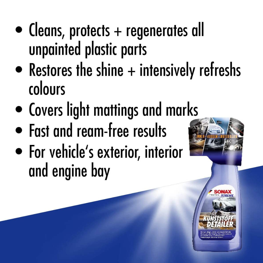 Детейлер для полировки и защиты наружного и внутреннего пластика SONAX XTREME Kunststoff Detailer 500 мл 255241. Данное средство от Сонакс является универсальным по уходу за наружными и внутренними элементами пластика, а так же пластика под капотом. SONAX Xtreme Kunststoff Detailer очищает, защищает и регенерирует все пластиковые детали, обеспечивая легкий блеск и интенсивное освежение цвета. Одновременно скрываются легкие заматованости и мелкие царапины.