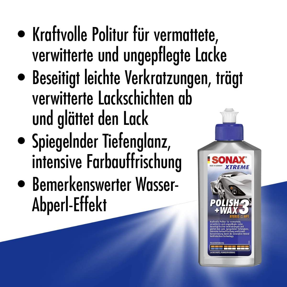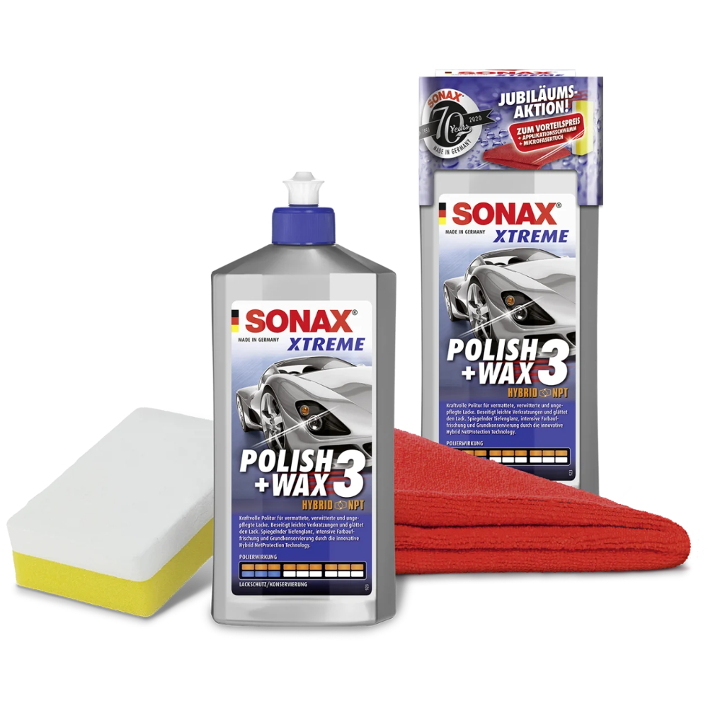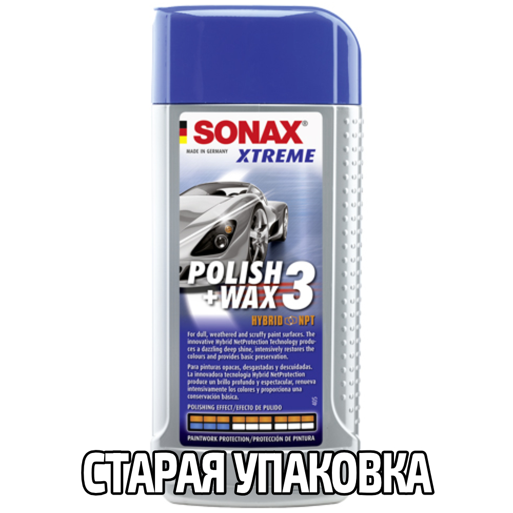 Очищаючий поліроль з воском SONAX XTREME Polish + Wax 3 Hybrid NPT 500 мл у наборі 202841. Глибоке полірування з високим ефектом полірування з дрібнодисперсійним порошком оксиду алюмінію , для поверхонь з потертостями, старих і недоглянутих автомобілів, а також для видалення нерівностей і напливів після фарбування. Глибокий дзеркальний блиск, інтенсивне освіження кольору та базовий захист отримує оброблена поверхня завдяки інноваційній технології Hybrid NetProtection. У Hybrid NPT є спеціальні неорганічні та органічні компоненти, які поєднуються у стабільну, стійку до погодних умов молекулярну мережу. Після обробки поверхня вразить вас своєю ніжною гладкістю, блискучим глибоким блиском і чудовим водовідштовхуючим ефектом.