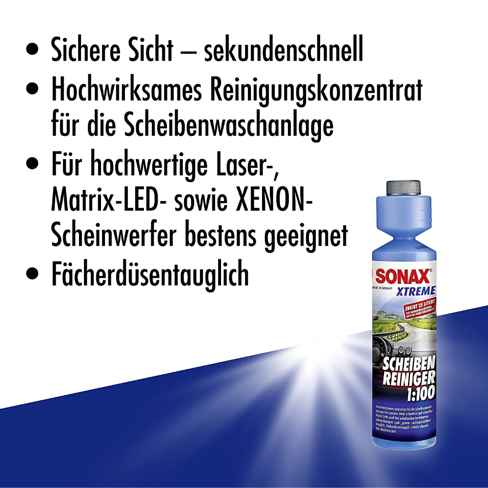 Не вызывает трещин и затемнений на линзах фар. Также идеально подходит для высококачественных светодиодных и ксеноновых фар, а также пластиковых линз в оптике из прозрачного стекла. Содержит глицерин и присадку против известкового налета. Чрезвычайно экономичный продукт: из 25 мл концентрата получается 2,5 л готовой очищающей жидкости.